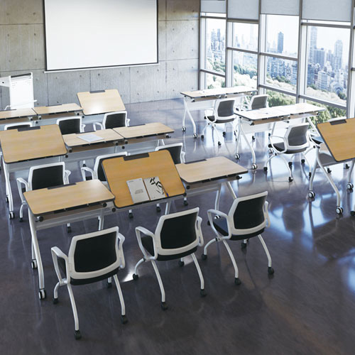 전면 빗각 디자인으로 직선형 책상에서 느낄 수 없는 세련되고 특별한 인상을 뮤보 사무용 책상에서 만나보세요.